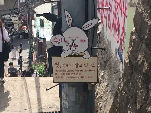 ในระหว่างการเที่ยวชมไม่ควรส่งเสียงดังเพราะที่หมู่บ้านแห่งนี้มีคนอาศัยอยู่จริงๆ จะมีป้ายบอกแบบนี้เป็นระยะๆ