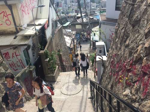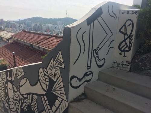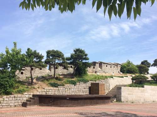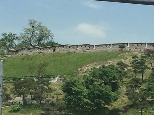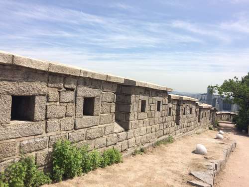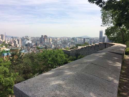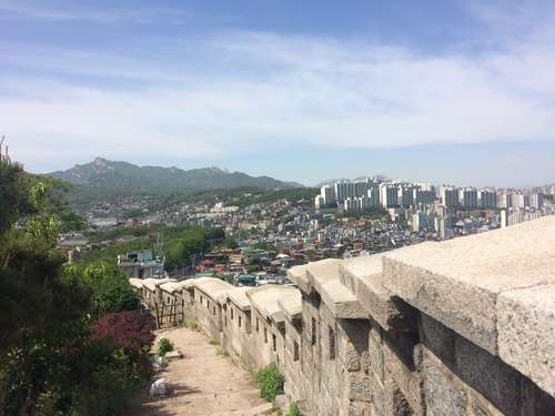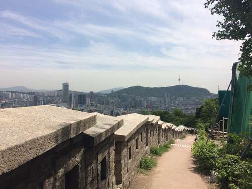 หลังจากชมศิลปะสวยๆ ของหมู่บ้านอีฮวาแล้วก็ไปชมกำแพงเมืองโซลที่อยู่ถัดจากหมู่บ้านกันค่ะ กำแพงเมืองโซลเป็นกำแพงที่สร้างขึ้นมาเพื่อป้องกันผู้รุกราน ทำมาจากหิน, ไม้, และวัสดุอื่นๆ กำแพงถูกสร้างขึ้นครั้งแรกเมื่อปี 1936 จุดประสงค์หลักในการสร้างสมัยนั้นคือเพื่อป้องกันผู้บุกรุกและแสดงเขตเมืองอันยาง (เป็นชื่อเมืองเก่าก่อนที่จะเปลี่ยนมาเป็นกรุงโซล) ในสมัยราชวงศ์โซชอน กำแพงเมืองโซลมีความยาวกว่า 18.6 กิโลเมตรยาวไปตามสันภูเขาคือ ภูเขาแบกัคซาน, ภูเขานัคซาน, ภูเขานัมซาน, และภูเขาฮันวังซาน ปัจจุบันนี้กำแพงแห่งนี้ได้ถูกกำหนดให้เป็นโบราณสถานของเกาหลี ฉบับที่ 10 ในปี 1963 รวมถึงประตู, ทางน้ำ, กองสัญญาณไฟ