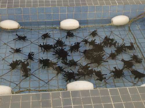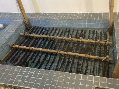 เปลือกหอยนางรมที่จะนำไปเพาะเลี้ยงที่ผ่านการฆ่าเชื้อแล้ว หลังจากนั้นจะนำใยสาหร่ายที่ปั่นละเอียดแล้วนำมาโรยที่เปลือกหอยนี้หลังจากนั้นเมื่อสาหร่ายติดกับเปลือกหอยแล้วจะถูกนำไปเลี้ยงต่อที่ในทะเล